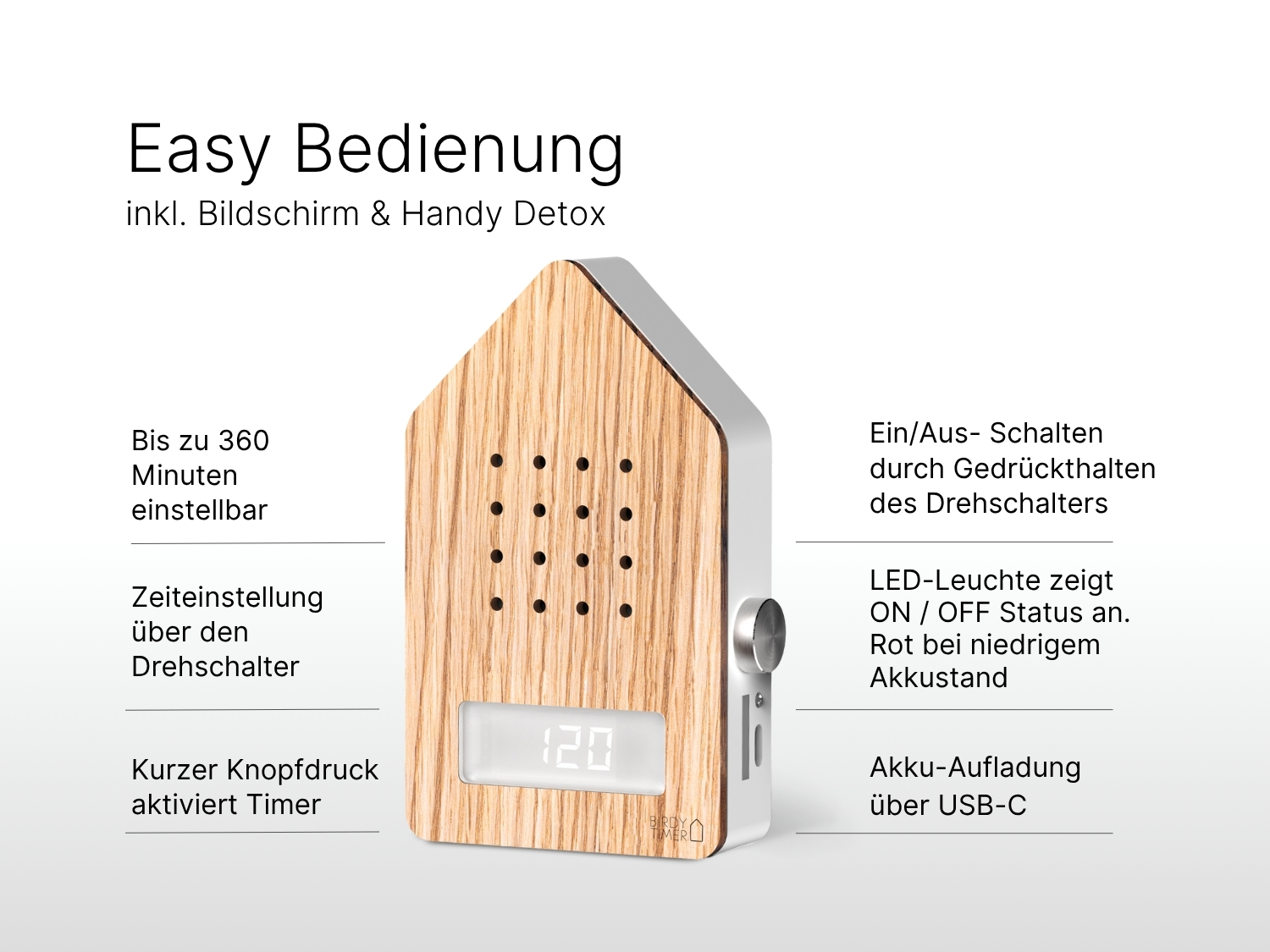 Der Birdytimer macht es leicht eine gute Zeit zu haben: Er zwitschert, wenn die Wunschzeit erreicht ist. Dabei sieht er auch noch gut aus, die edle Designfront aus 100% Eichenholz wird in unserer Thüringer Holzmanufaktur von Hand veredelt, um ein edles Finish zu erreichen. Das Vogelhaus-Design ist ein Klassiker, der perfekt zum Sound passt.